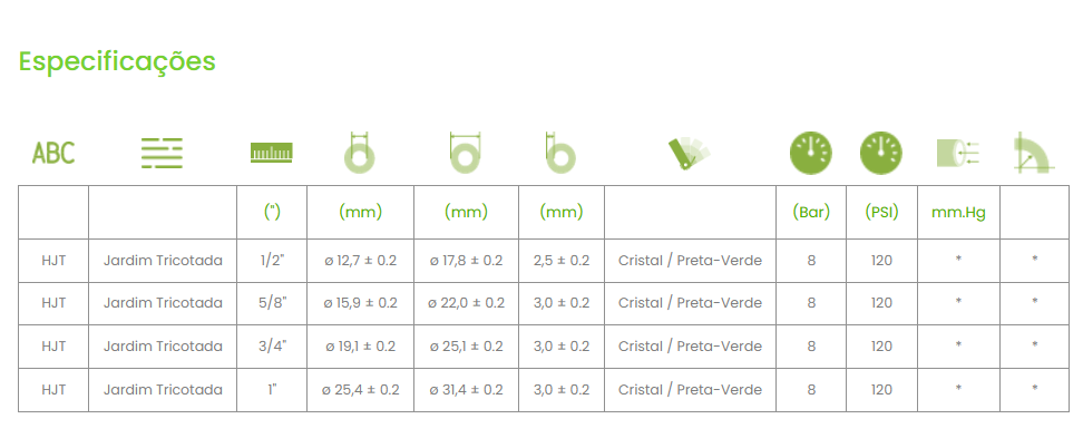 • Estrutura: 3 camadas (PVC interno, reforço tricotado em poliéster, PVC externo)